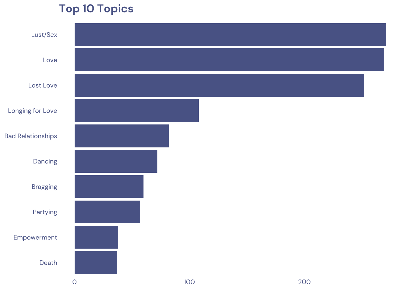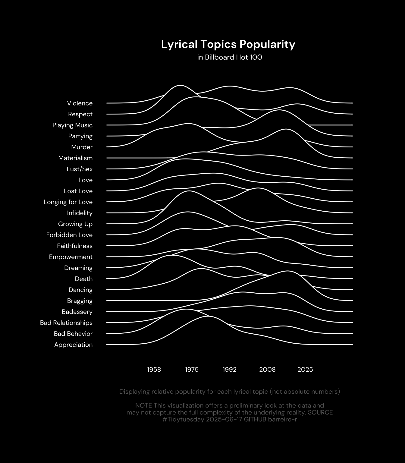 caption = paste0("Displaying relative popularity for each lyrical topic (not absolute numbers)\n\n", str_wrap("NOTE This visualization offers a preliminary look at the data and may not capture the full complexity of the underlying reality. SOURCE #Tidytuesday 2025-06-17 GITHUB barreiro-r", width = 70))