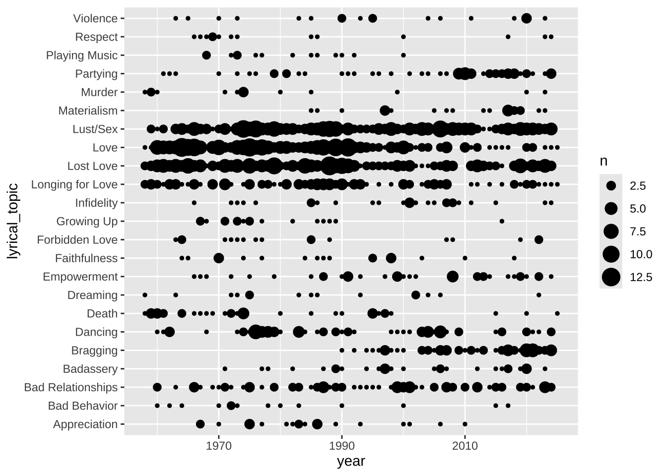 data2plot ggplot(aes(y = lyrical_topic, x = year)) +