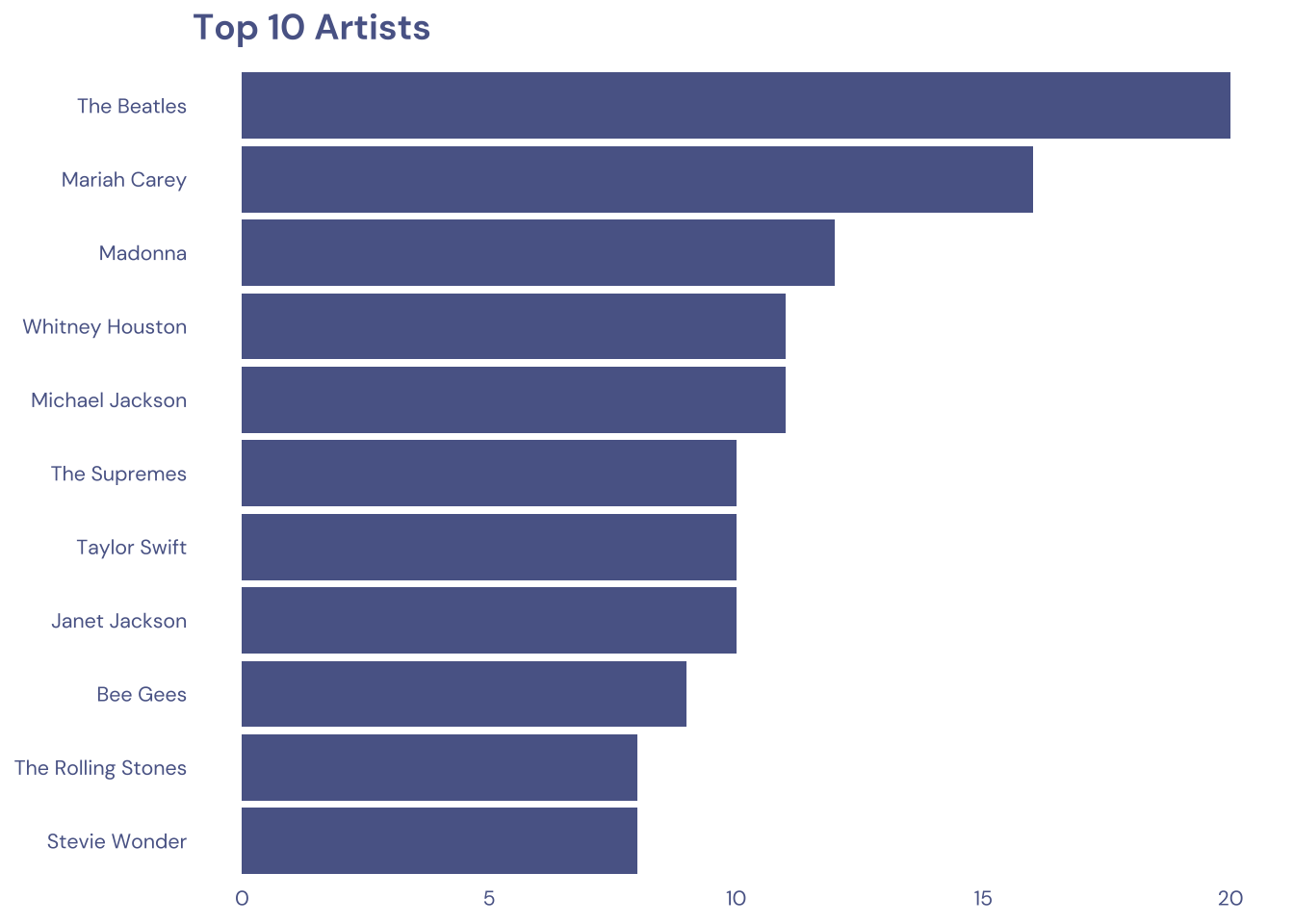 This week we are exploring the Billboard Hot 100 Number Ones Database. This workbook contains substantial data about every song to ever top the Billboard Hot 100 between August 4, 1958 and January 11, 2025. It was compiled by Chris Dalla Riva as he wrote the book Uncharted Territory: What Numbers Tell Us about the Biggest Hit Songs and Ourselves. It also often powers his newsletter Can’t Get Much Higher.