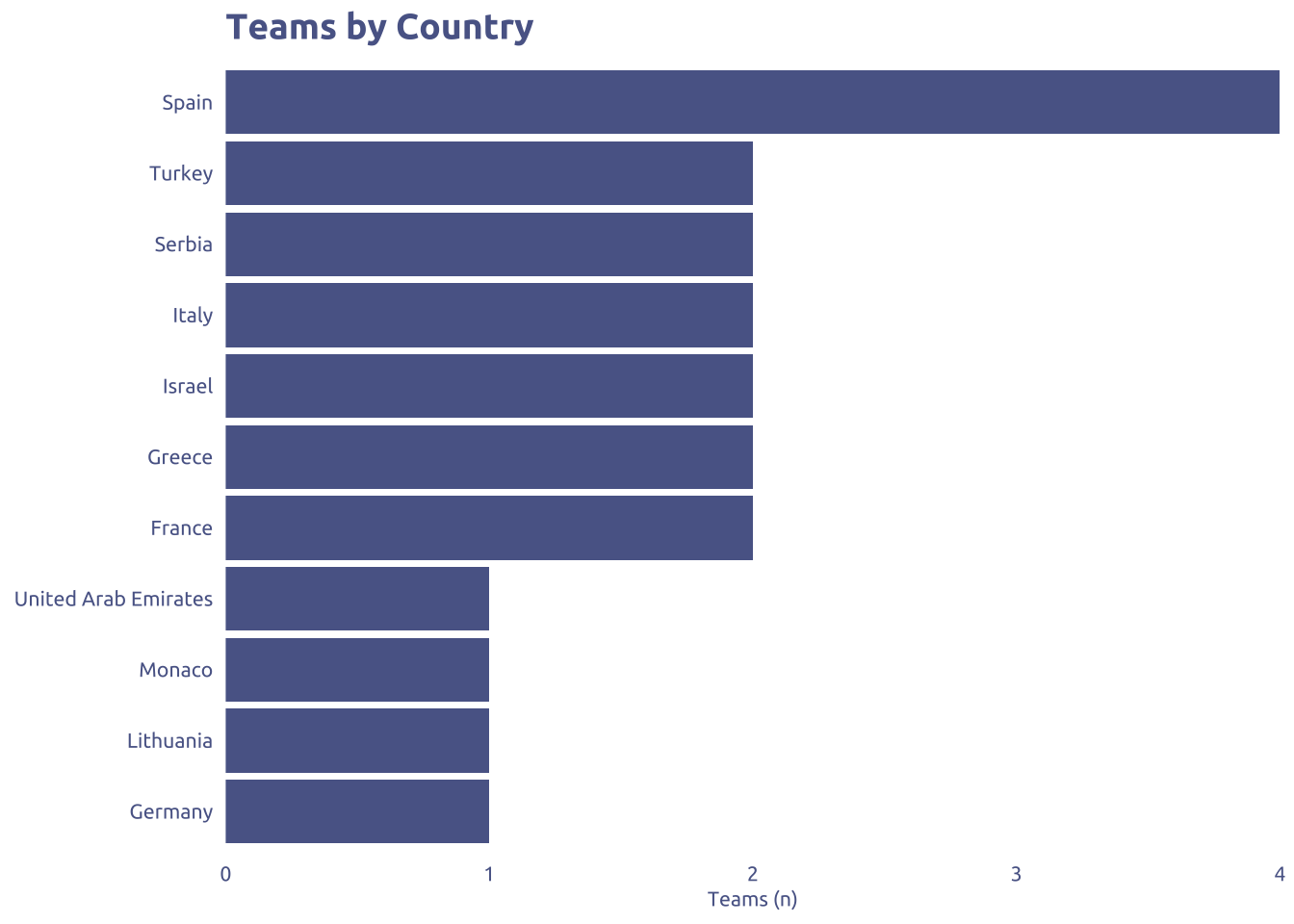 labs(title = "Teams by Country", x = "Teams (n)", y = NULL) +