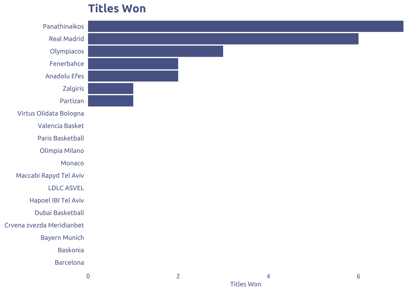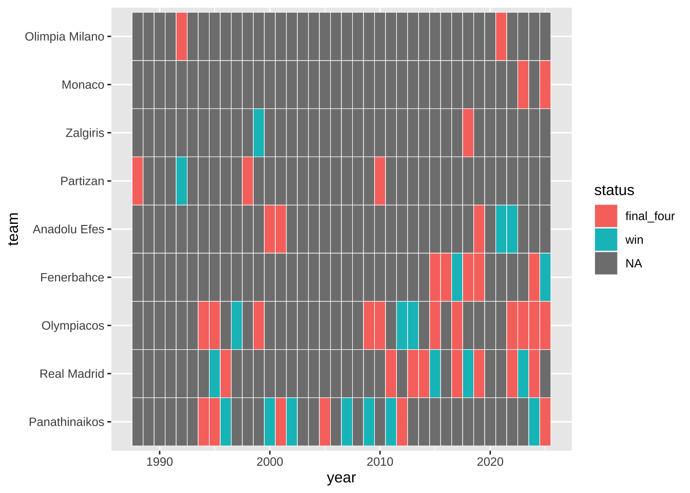 glue("Historical performance of EuroLeague Basketball teams.<br>(<span style='font-size:8pt; color:{cool_red1}'>Wins</span><span style='font-size:8pt; color:{cool_gray2}'> /Final four)</span>"),