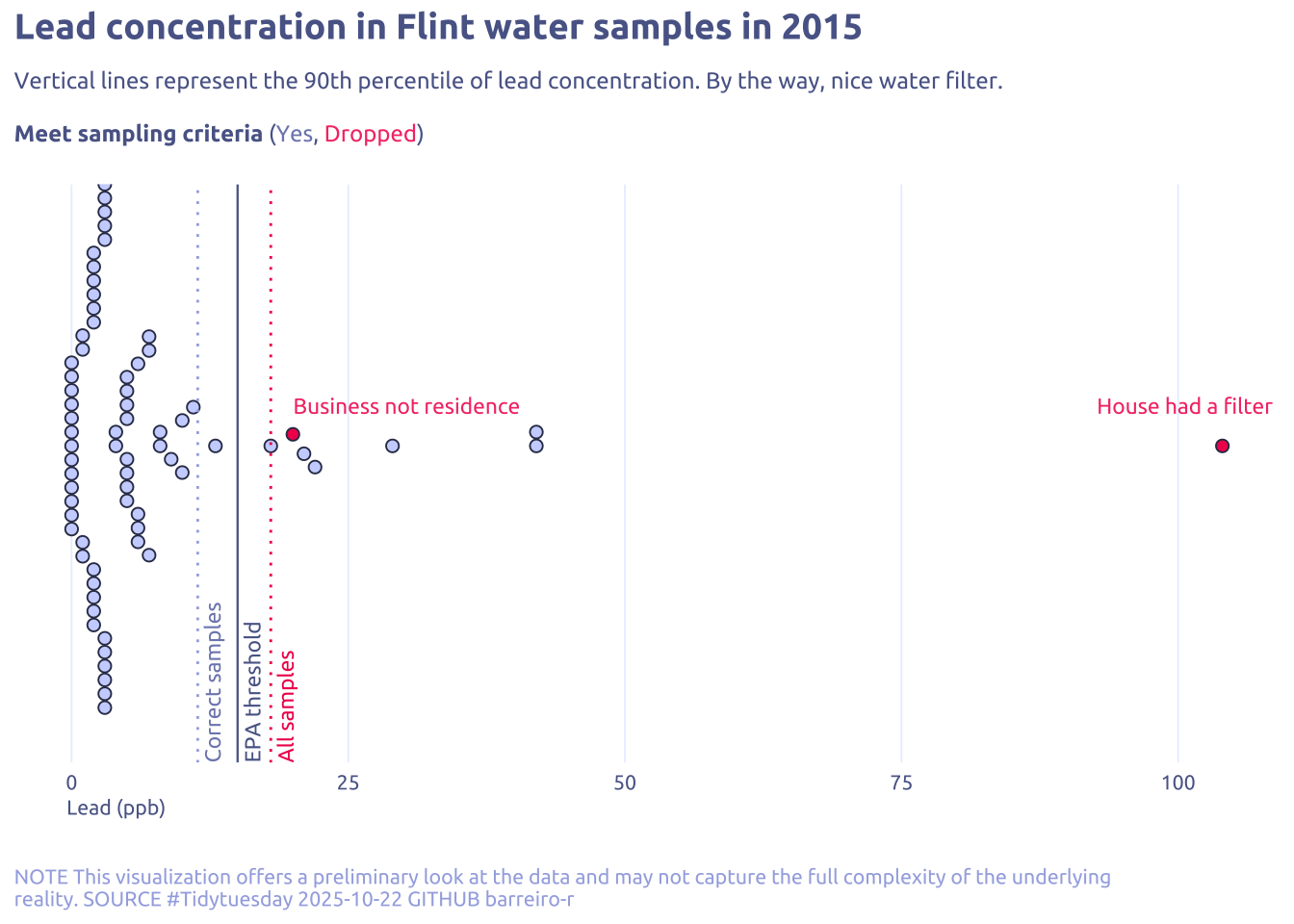 'Vertical lines represent the 90th percentile of lead concentration. By the way, nice water filter.<br><br>**Meet sampling criteria** (<span style="color:#7e89bb">Yes</span>, <span style="color:#F43E75">Dropped</span>)',