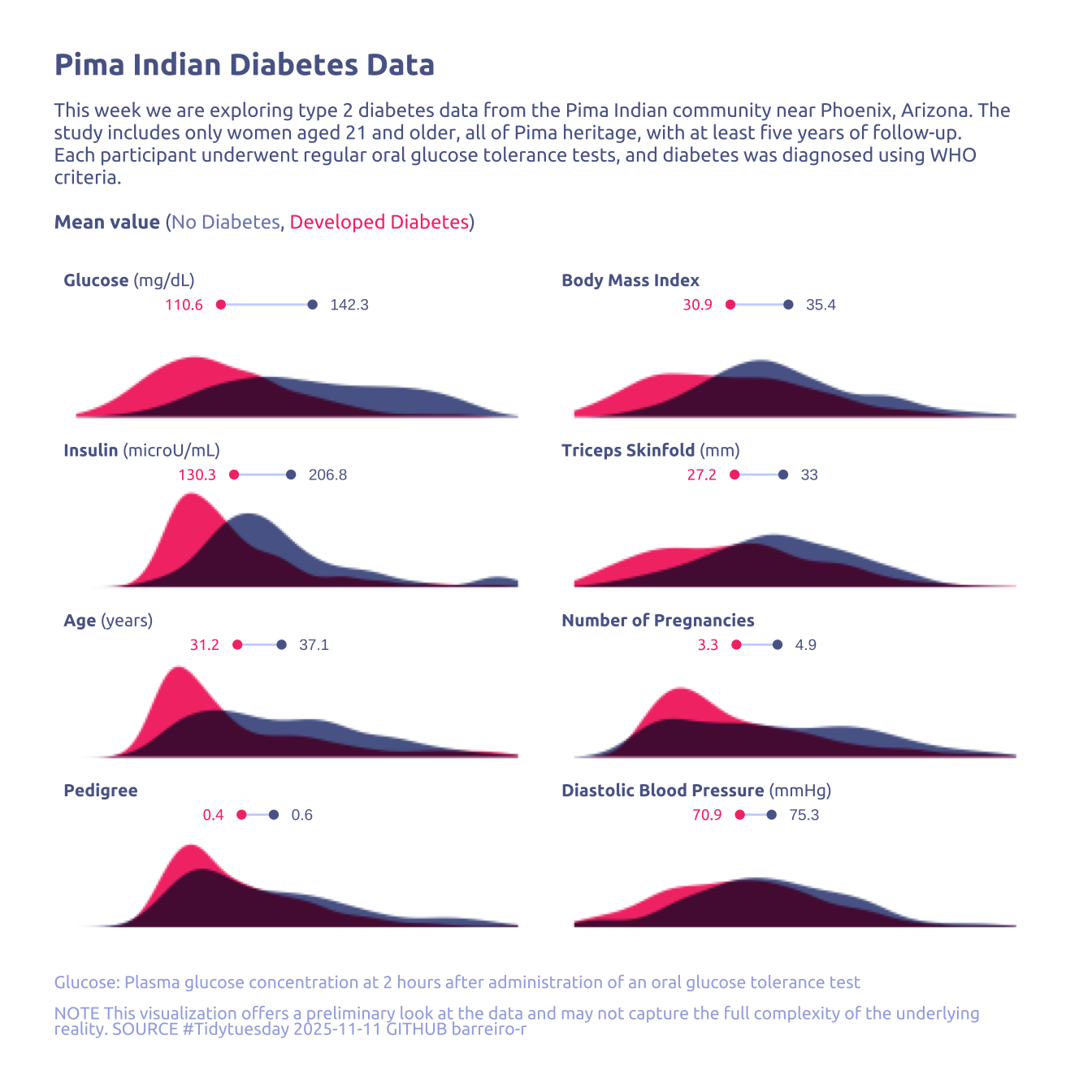 'This week we are exploring type 2 diabetes data from the Pima Indian community near Phoenix, Arizona. The study includes only women aged 21 and older, all of Pima heritage, with at least five years of follow-up. Each participant underwent regular oral glucose tolerance tests, and diabetes was diagnosed using WHO criteria.',
