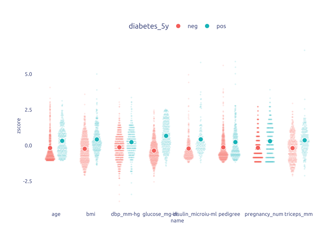 '<br><br>**Mean value** (<span style="color:#7e89bb">No Diabetes</span>, <span style="color:#F43E75">Developed Diabetes</span>)'